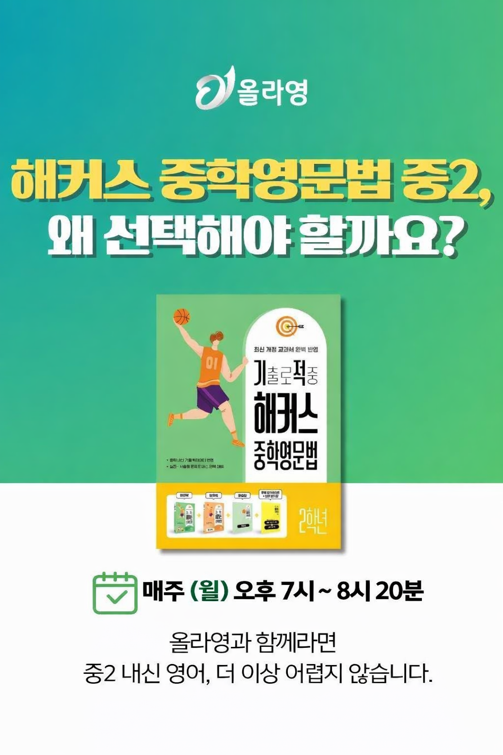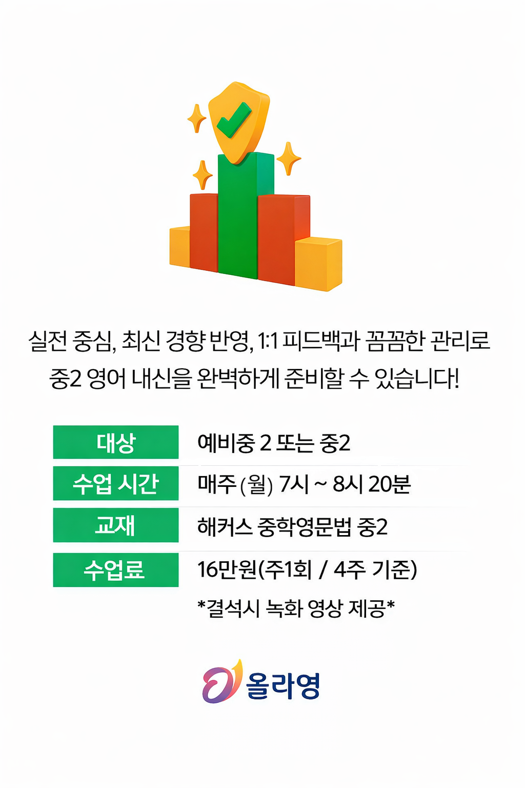 - 최대 인원 : 10명 - 중2 문법으로 뛰어넘기 딱 좋은 라이브 수업 - 매주 월요일 오후 7:00-8:20 - 개강일 : 26년 1월 5일 - 신청기간 : 인원 마감시 종료