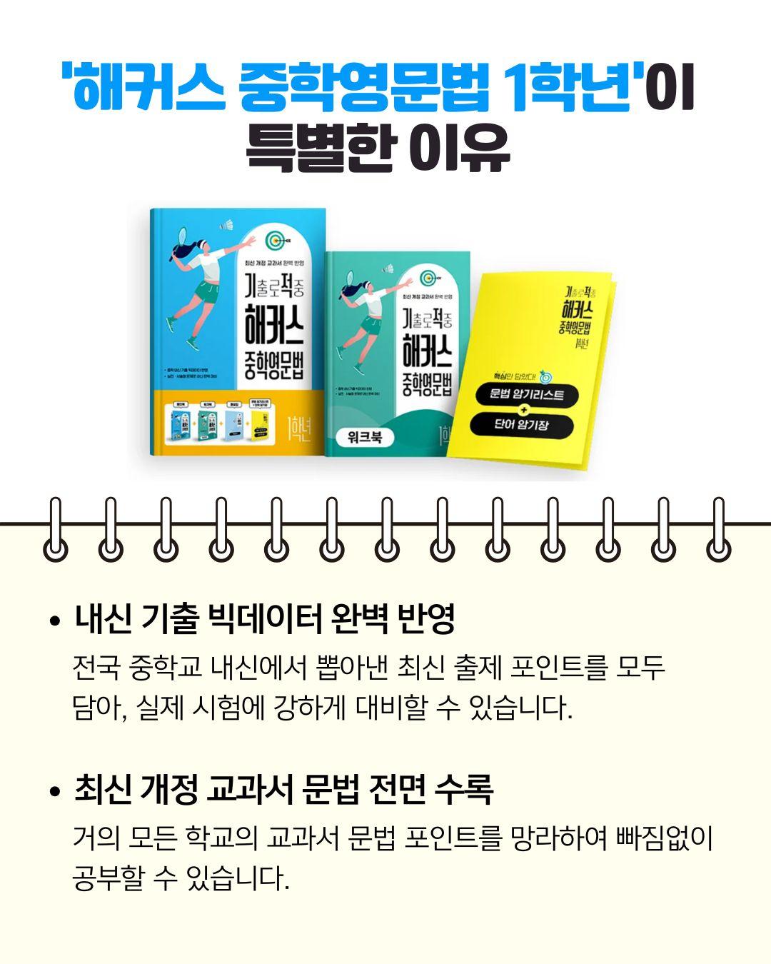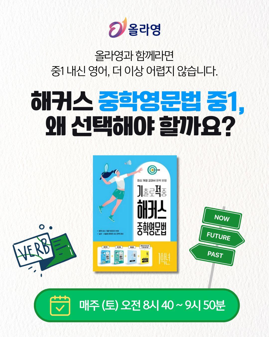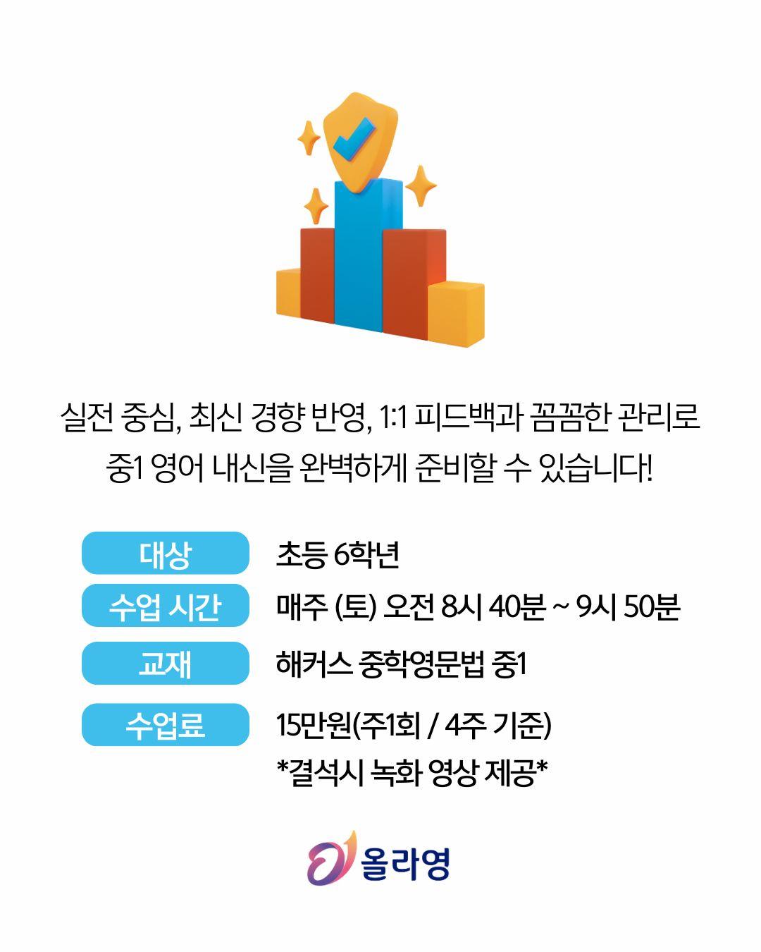 해커스 중학영문법 중1 강의 소개 중학교 1학년을 위한 해커스 중학영문법 Level 1 수업입니다. 내신 핵심 문법 개념을 체계적으로 익히고, 실전 문제로 바로 적용하는 수업이에요. 교재: 해커스 중학영문법 Level 1 목표: 중1 필수 문법 완벽 정리 + 내신 대비 실전 훈련 특징: 개념→예문→실전문제 3단계 학습, 단원별 핵심 포인트와 오답 분석 운영: 주 1회 / 월 4회 수업 수강료: 월 15만 원 방식: 실시간 수업 + 월 1회 개별 피드백 제공