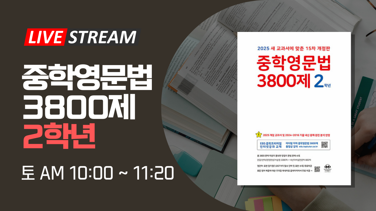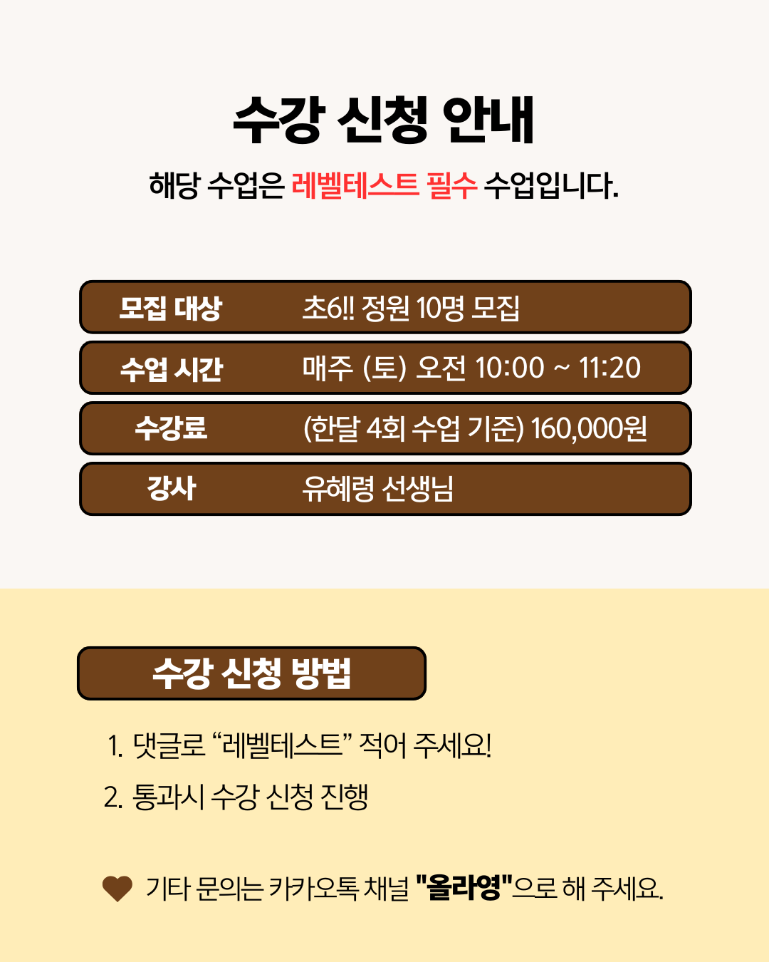 - 최대 인원 : 15명 - 중2 문법을 끝내고 중3 문법으로 들어가기 딱 적당한 수업 - 14-16주 강의, 매주 토 오전 10시-11시20분 - 수강료 매월 (4회) 16만원
