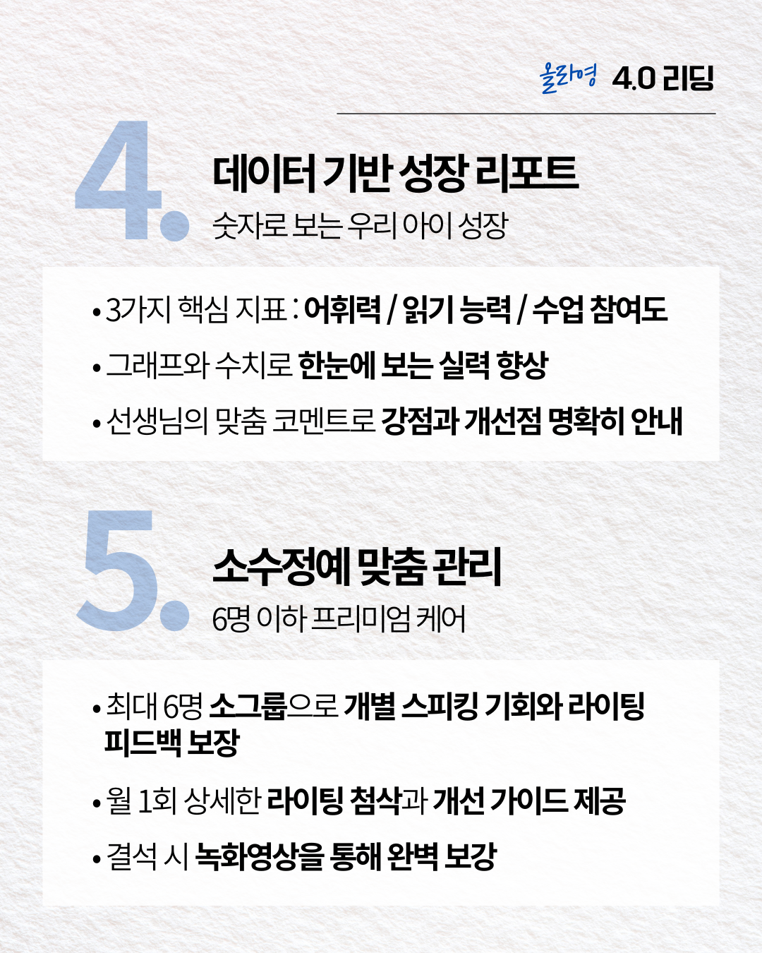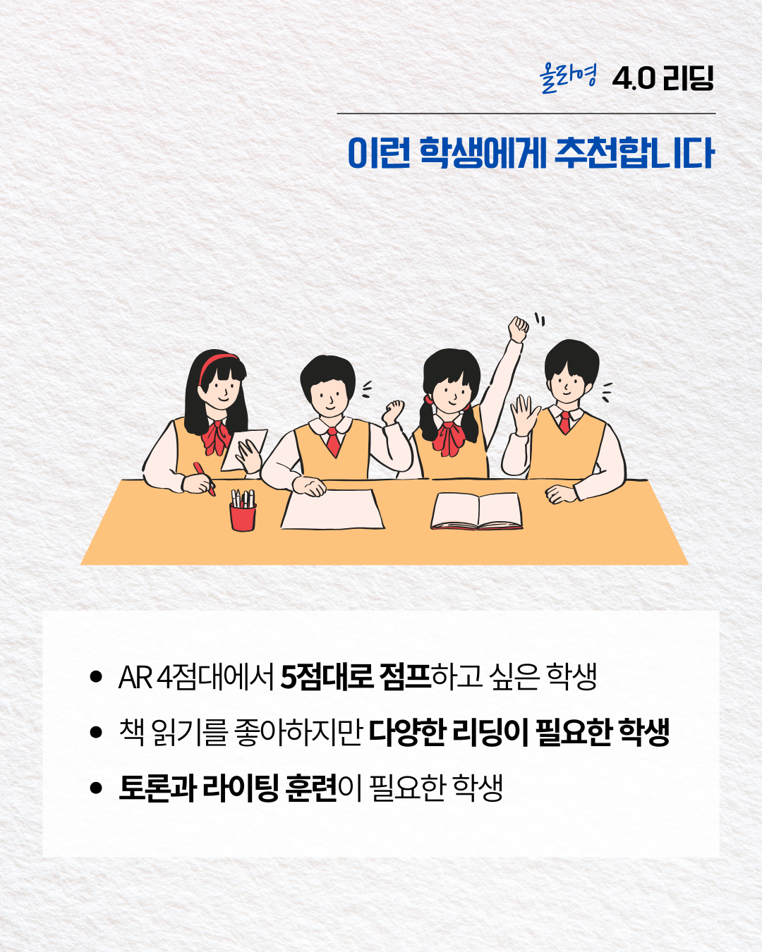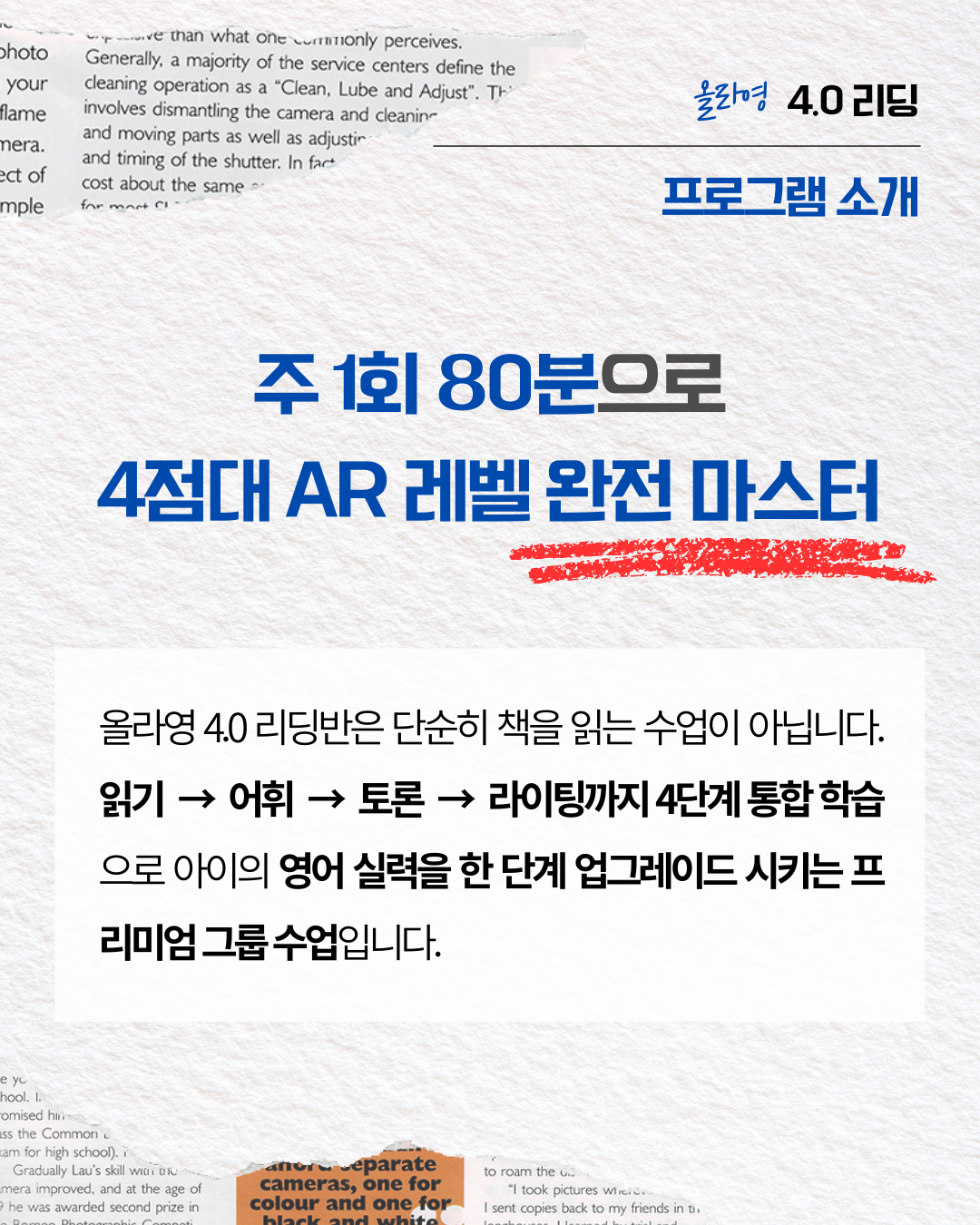 단순히 ‘읽는’ 영어는 그만. 원서를 이해하여 자기 것으로 만드는 리딩 훈련. 매 시간, 주제 리딩 → 어휘·문법 적용 → 비판적 사고 질문까지 한 번에. 단 4주 만에 영어로 생각하는 힘이 달라집니다.