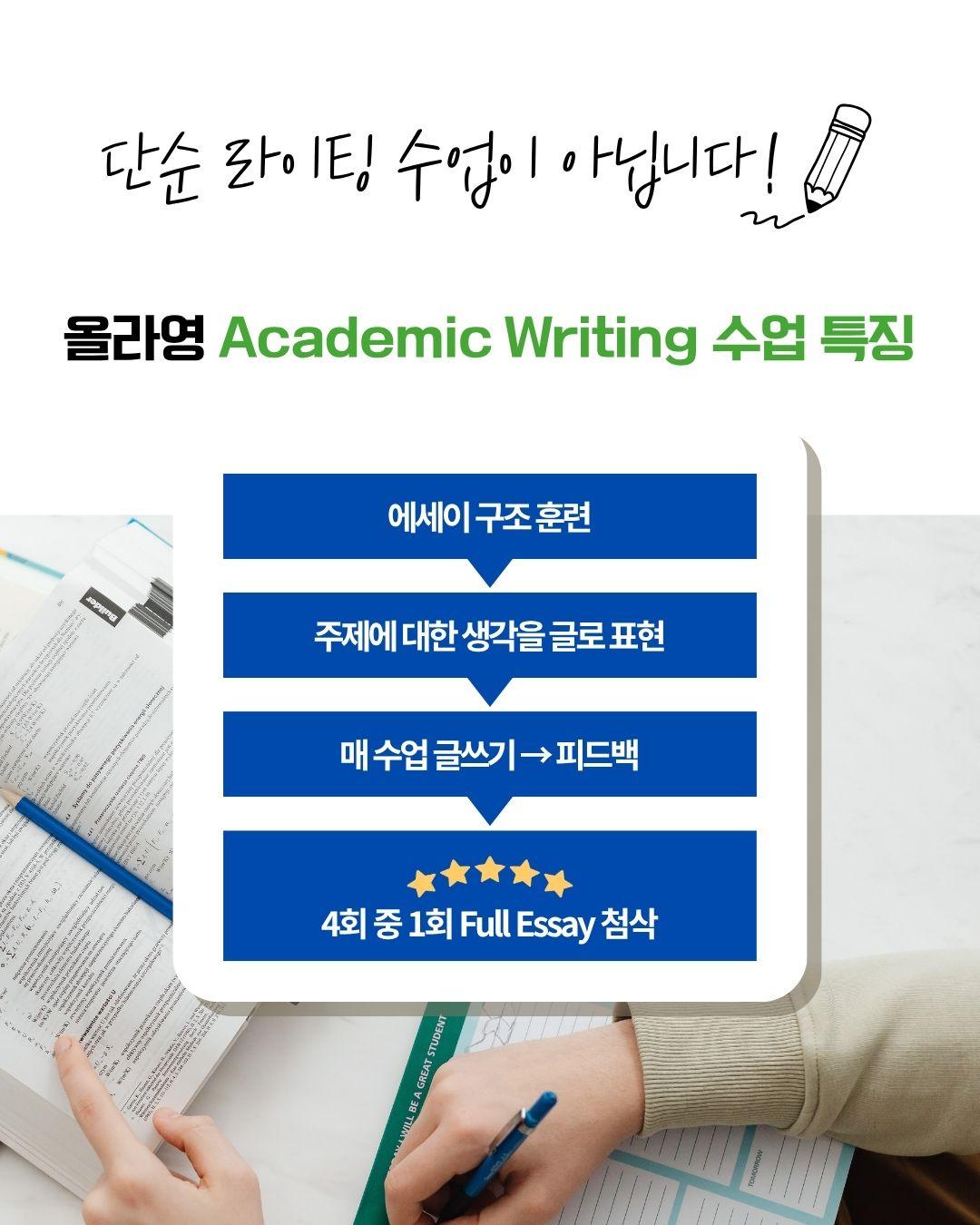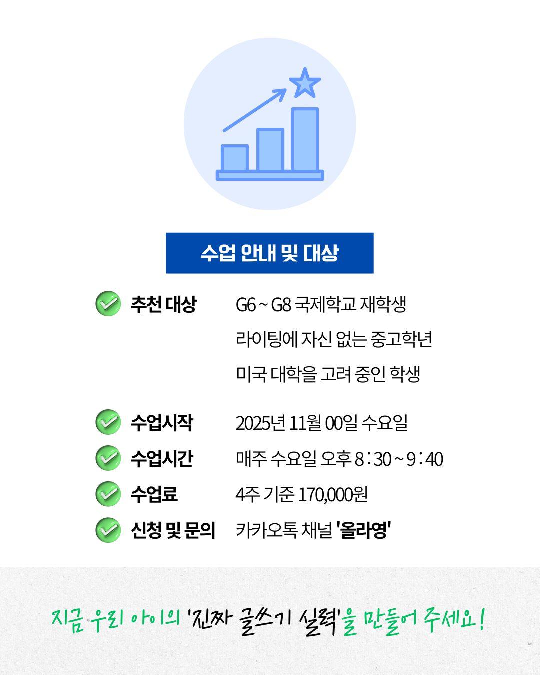 올라영 · G6 Writing 문장력부터 글의 뼈대까지, 6학년에서 끝내는 라이팅 기본기 국제학교·유학생을 포함한 6학년 대상 라이팅 프로그램입니다. 아이가 이미 알고 있는 영어를 문장 → 문단 → 완성글로 자연스럽게 확장하도록, 교사가 옆에서 실제로 코칭합니다. 정확하게, 결과로 증명합니다. 수업 핵심 문장 설계: 문장 구조, 연결어(Transitions), 다양한 문법 활용 문단 구성: Topic–Support–Closing, 논리 흐름(PEEL) 장르 쓰기: Narrative / Opinion / Summary / Response 운영 방식 주 1회 실시간 코칭 + 과제 피드백(개별 코멘트 & 문장 교정) 짧은 강의 영상으로 예습 · 복습 가능 월 1회 Writing Assessment로 성장 기록 부모님께 진행 리포트 제공 차시 0차시 / 4강 / 324분 닫기 30일 과정 240,000원 29% 170,000원 총 결제금액 170,000원 29% 할인중240,000원 → 170,000원 총 결제금액170,000원 관심도서 장바구니 바로구매 무료공개 닫기 수강하셨나요? [한번에 끝내는] 네트워크 관리사 (2급 종합반) 강의는 이 강의를 수강하신 후 수강을 추천드려요! 패키지일러스트레이션˙디지털드로잉 신진열 교수, 이성일 교수 좋아보이는 움직임 모션그래픽 67% 20,000원 패키지메타버스˙A.I 신진열 교수, 이성일 교수 메타버스와 리얼리트 67% 20,000원 패키지3D 최상준 교수 입체감있는 3D 이모티콘 제작 98% 47,900원 패키지메타버스˙A.I 신진열 교수, 이성일 교수 메타버스와 리얼리트 67% 20,000원 건너뛰기 닫기